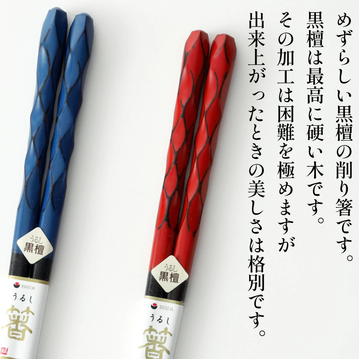 黒檀は最高に硬い木です。 その加工は困難を極めますが 出来上がったときの美しさは格別です。 「箸」と「橋」と「梯子」(はしご)の「はし」は 異なるふたつの世界を結びつけるという同じ語源です。 箸は人と人、人と神様を結ぶ縁起物です。 贈る人と贈られる人が幸せになれる、縁起物の箸渡し。お中元にどうぞ。 |