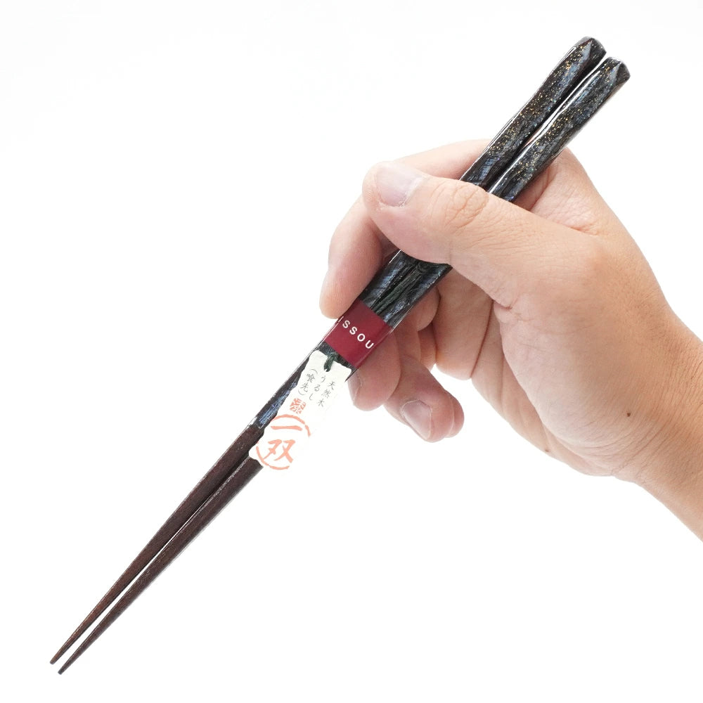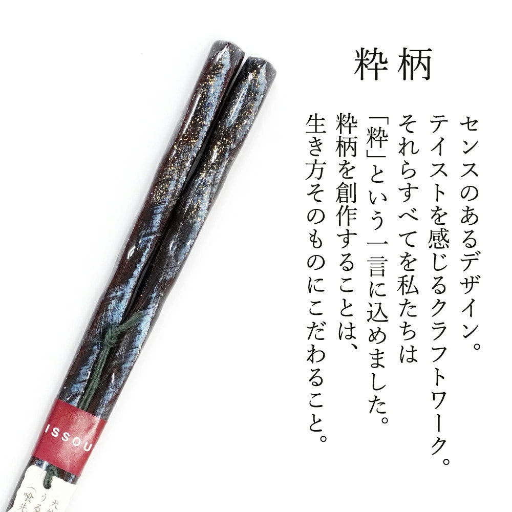桐箱入りでお届けしますので父の日や誕生日など親御様へのプレゼントにもおすすめです。 粋柄:センスのあるデザイン。 テイストを感じるクラフトワーク。そんな言い方のすべてを、私たちは「粋」というひと言に込めてきました。 粋柄を創作することは、生き方そのものにこだわること。 新たな拡がりを見せる、一双オリジナルスタンダード。 曇りのない夜空を輝く金色の星と息を飲む程美しいオーロラを表現した幻想的なお箸。 華やかなデザイン性だけではなく先丸の箸先はつかみやすい形状になっています。 |